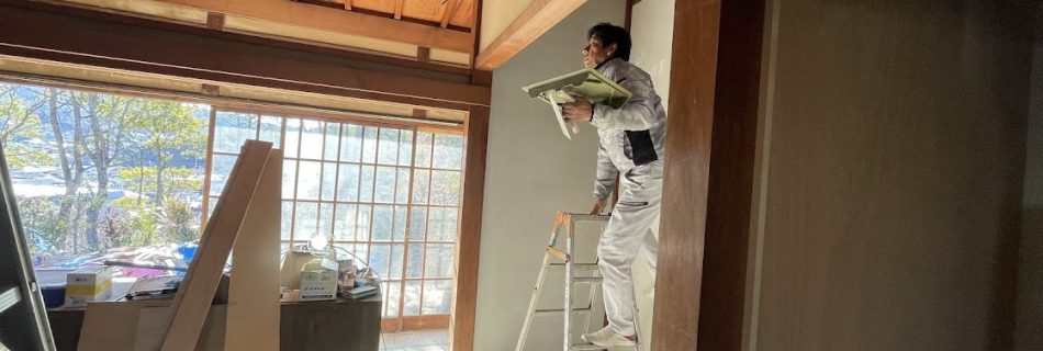 床の間の壁も最後の仕上げ 2025年12月下旬、100年古民家 淡輪山荘の床の間の壁も最後の仕上げに入りました。美しく本塗りされた壁は大正迎賓館にふさわしい品格を醸しています。 The tokonoma wall als …