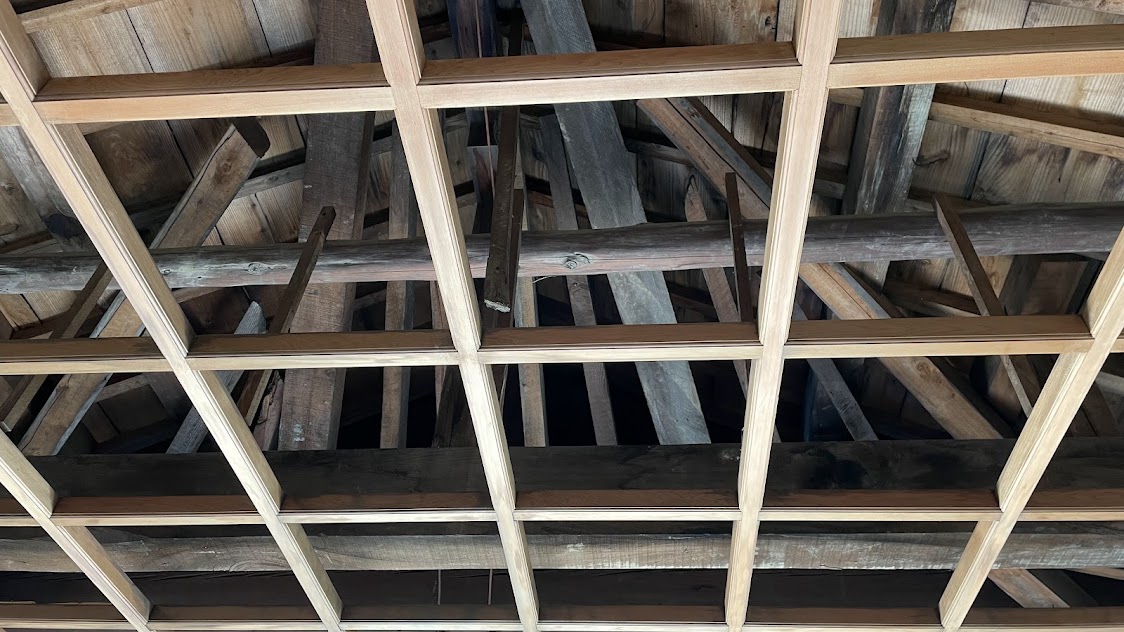 On July 31, 2025, the grid, the plate of coffered ceiling at the entrance of the Sanso was removed. Looking at the beautiful timber frame in the attic,