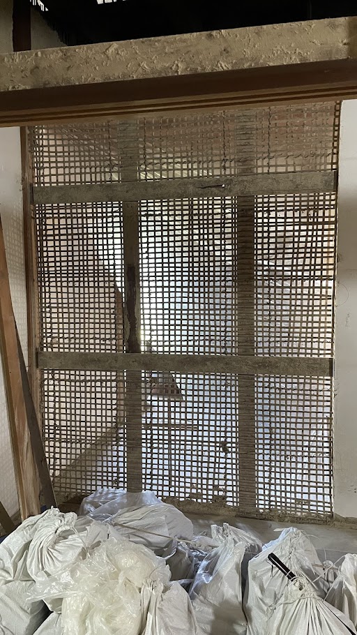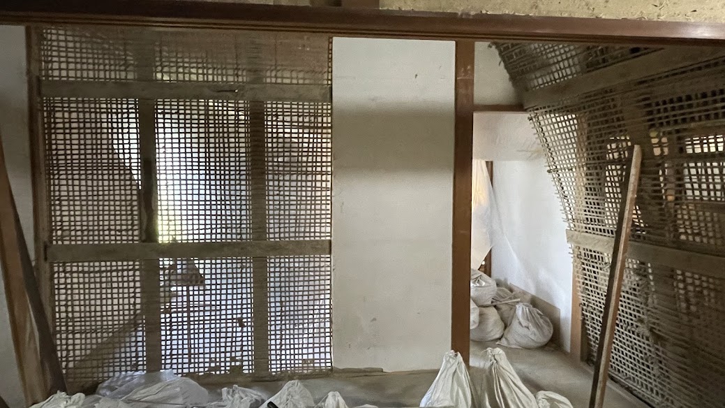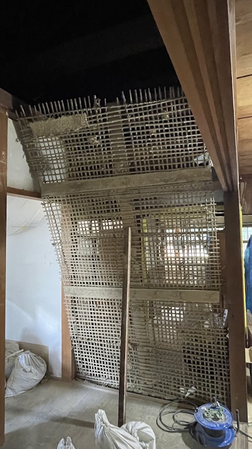 100年古民家 淡輪山荘の壁をはがすと、精緻に編み上げられた竹小舞の下地が出現しました。職人技を目の当たりにできる素晴らしい瞬間です。