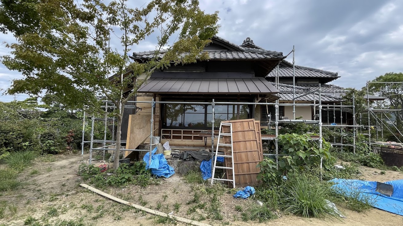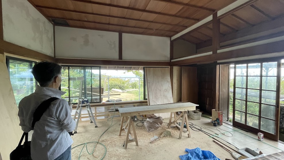 100年古民家 淡輪山荘の西端和室、海の大パノラマを楽しむ大窓が設置完了by kozuに 100年古民家、リノベーション、淡輪山荘on 投稿日: 2025年10月27日 西端和室、海の大パノラマを楽しむ大窓、設置完了 100年古民家 淡輪山荘の西端和室、海の大パノラマを楽しむ大窓が設置完了しました。かつて竹中源助の居室として愛用された和室。風雨に侵され壁も窓も悲惨な状態だったものが、みごとに美しく修復されました。