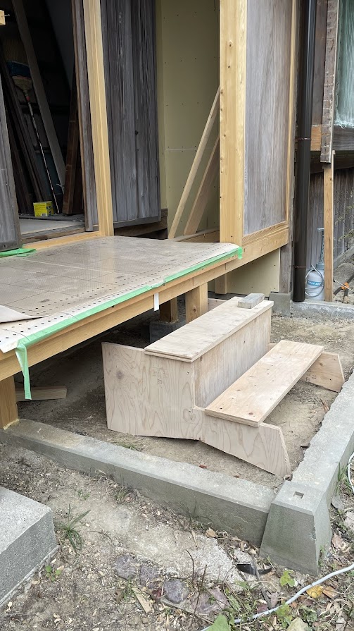 100年古民家 淡輪山荘の工事現場では大工仕事の粋を随所に見ることができます。例えば仮階段も安定構造で、あっという間に木で作ってしまいます。