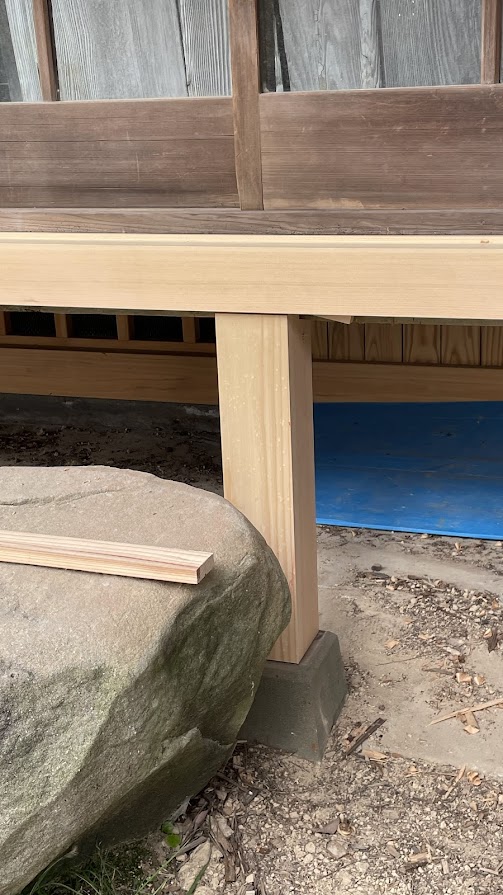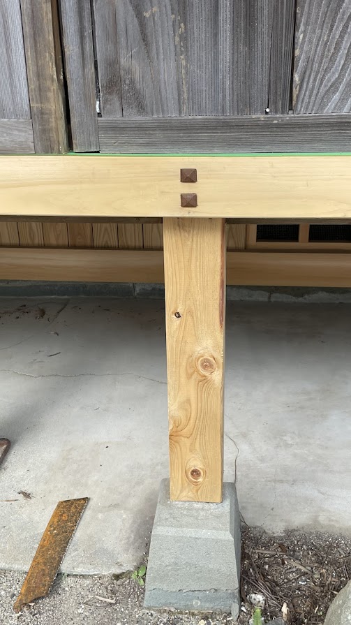 また、廊下の下を支える柱の止め。ねじ止めしてネジの頭を木の装飾で隠す、ネジ止めせず接手で止める。場所・状況に応じて使い分け!