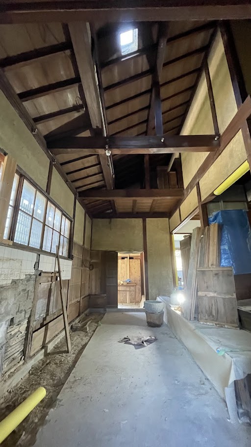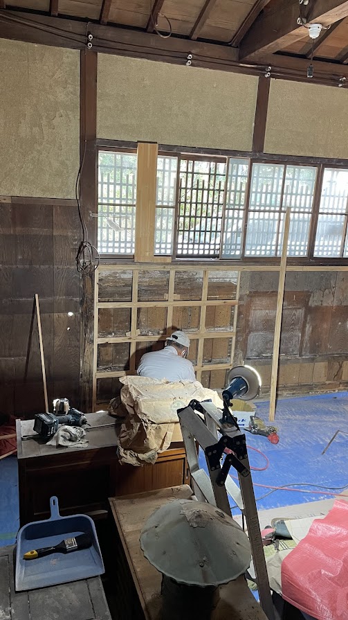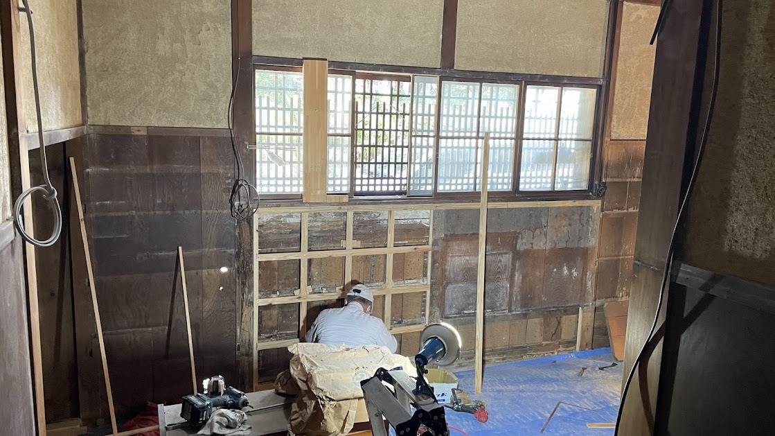 2025年11月下旬、100年古民家 淡輪山荘の土間の傷んだ壁の修復が進行中です。腐食していた部分を補強し壁全体に板張りをするために下地から作っていきます。