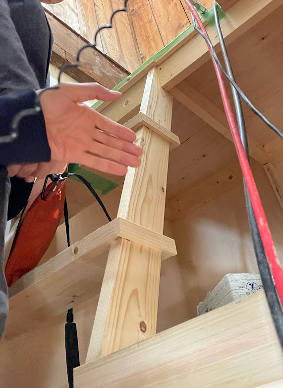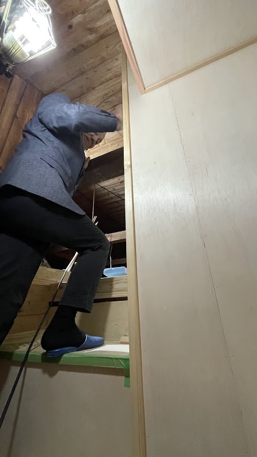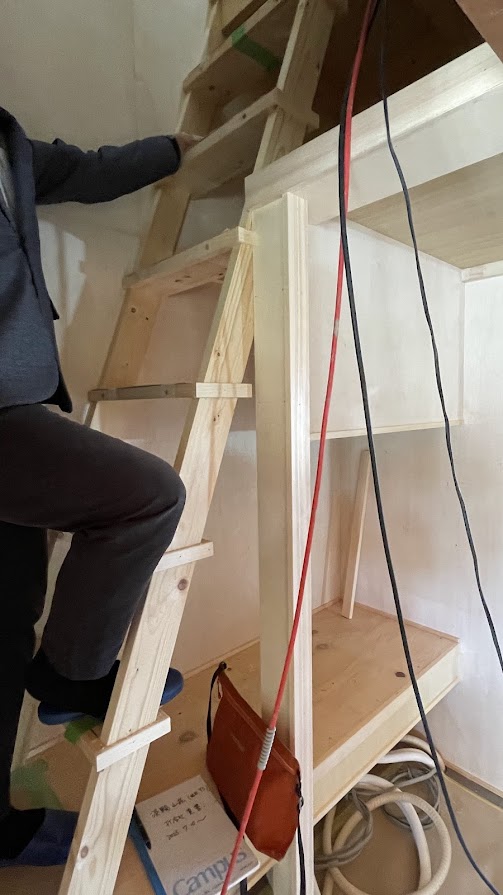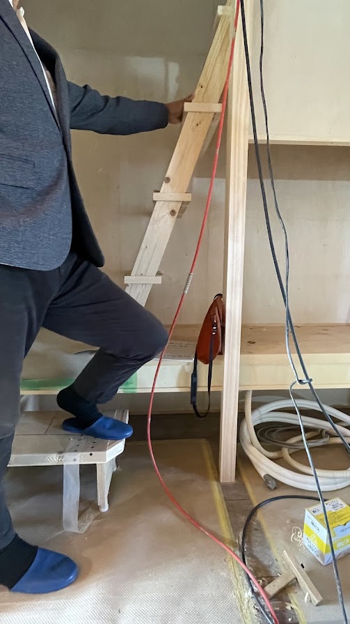 2025年12月19日、淡輪山荘の屋根裏階段が完成。手すりの取付け位置を検討。急角度の階段のため、安心して登れるように手すりは必須のものです。