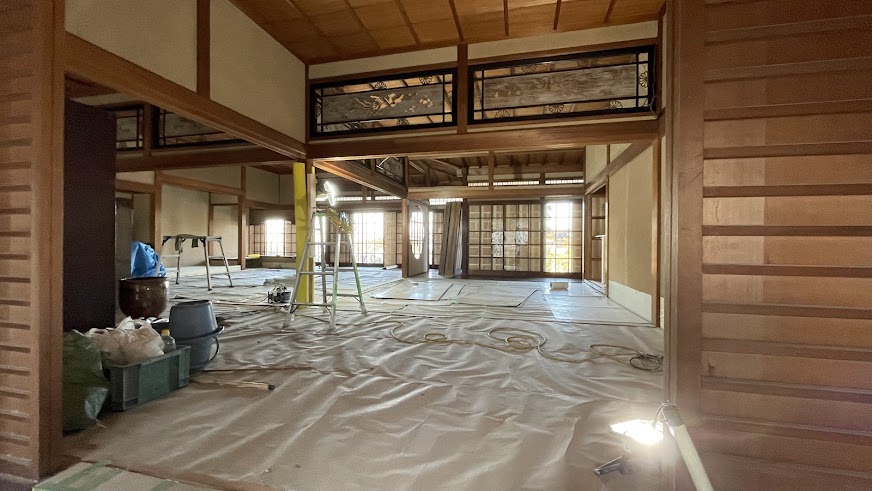 2026年1月7日、100年古民家 淡輪山荘は洗い作業の真っ最中。大正迎賓館にふさわしく、廊下や柱、天井、窓ガラスなどがきれいに吹き上がられていきます。