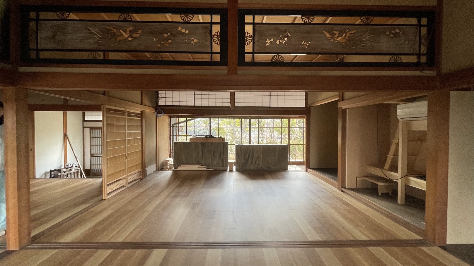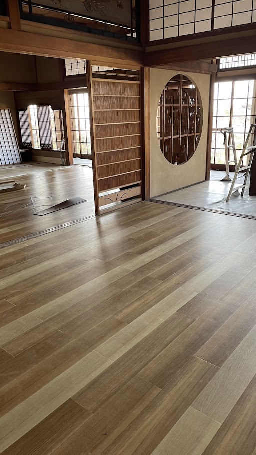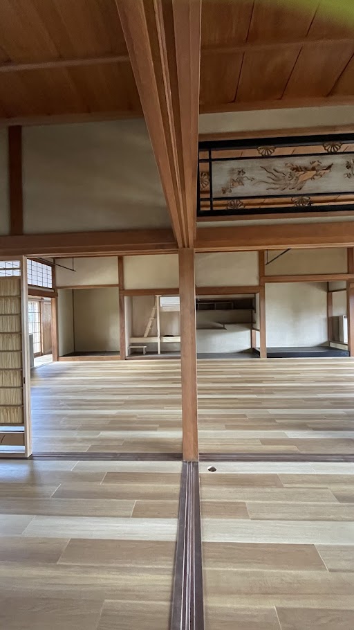 2026年1月29日、大正迎賓館 淡輪山荘の広間のフローリングが完成。田の字の4つの座敷、全39畳がい連につながった様は壮観。