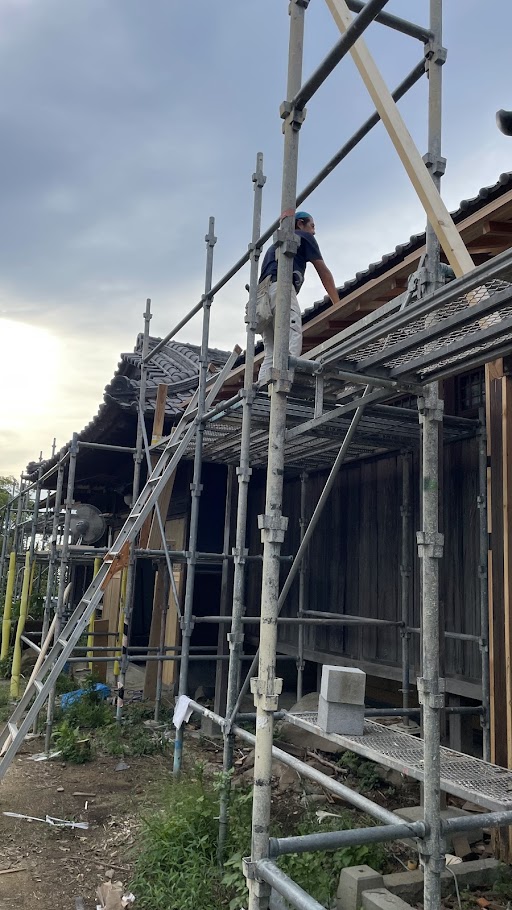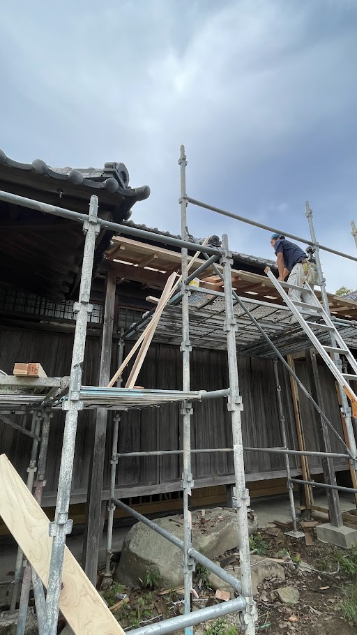 2025年9月13日、100年古民家 淡輪山荘の正面の野地板と垂木も改修が進んでいます。先に大幅にリノベーションされた海側部分に引き続き、淡輪山荘の顔となる玄関も野地板と垂木の損傷部分を美しく修復していきます。
