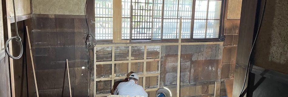 淡輪山荘の土間の壁修復 2025年11月下旬、100年古民家 淡輪山荘の土間の傷んだ壁の修復が進行中です。腐食していた部分を補強し壁全体に板張りをするために下地から作っていきます。
