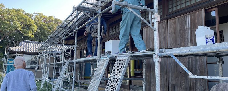 屋外足場もすべて取り外し本来の姿を見せる淡輪山荘 2025年11月中旬、100年古民家 淡輪山荘は屋外足場もすべて取り外し本来の姿を見せました。建物の全容を遮るものなく眺めることができます。