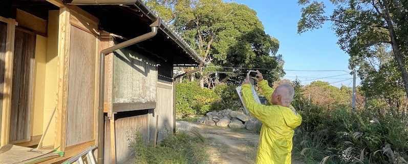 樋施工のため事前調査を行う 2025年11月8日、淡輪山荘の樋施工のため事前調査を行いました。どの位置に樋からの水を落としていくのがベストポジションかを入念にチェック。