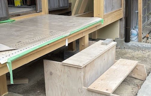 工事現場では大工仕事の粋を随所に見ることができる 100年古民家 淡輪山荘の工事現場では大工仕事の粋を随所に見ることができます。例えば仮階段も安定構造で、あっという間に木で作ってしまいます。また、廊下の下を支える柱の止め …
