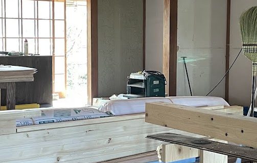 淡輪山荘の鴨居の垂れを修復 2025年10月下旬に入り、100年古民家 淡輪山荘の鴨居の垂れを修復。南側の和室の鴨居の中央部分が下がって、障子が閉まらなくなっていました。建築士、大工さんが協議の末、鴨居の上の柱を一部分切 …